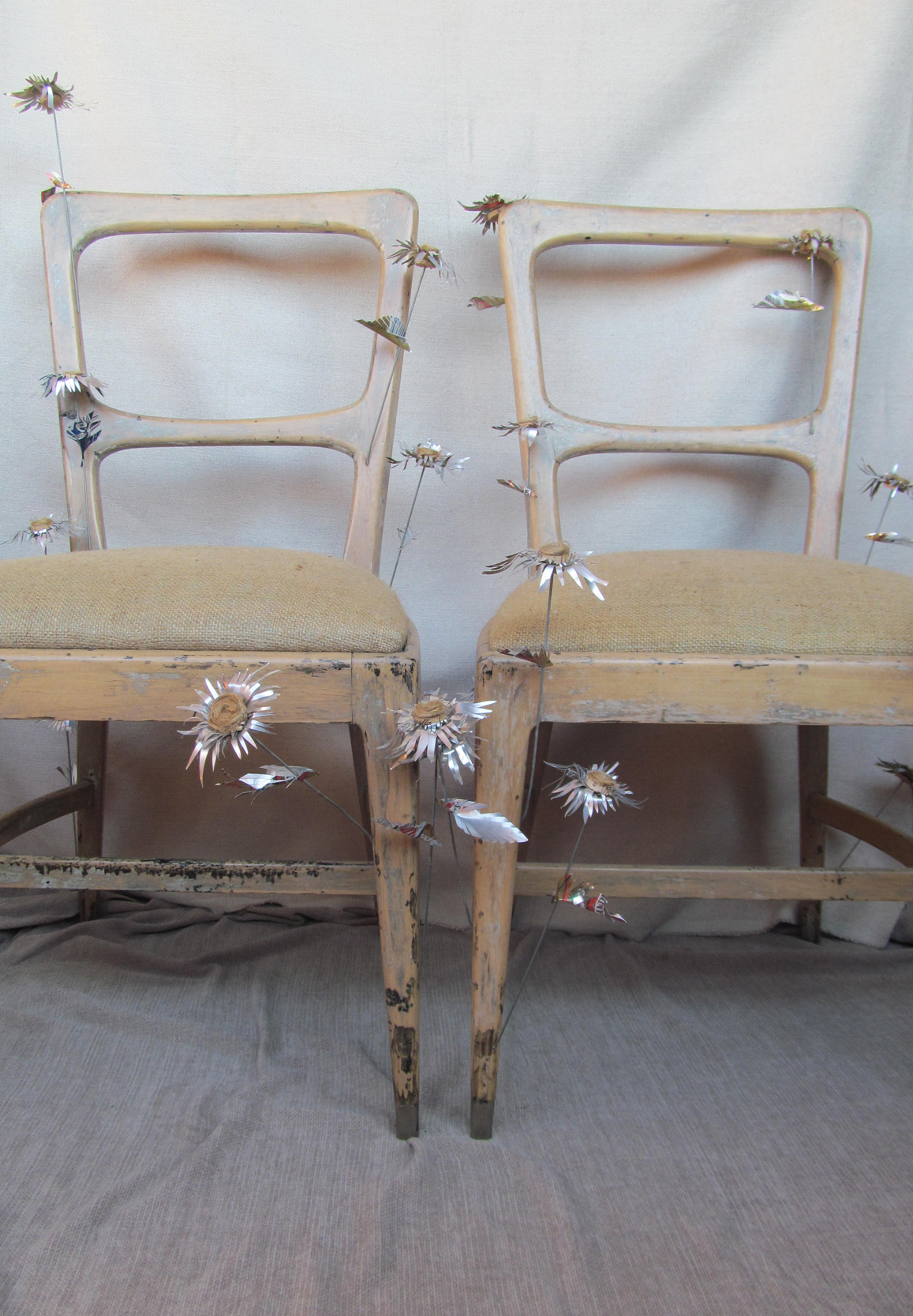 Estas sillas esculturas de material reciclado, donde predominan las flores de hojalata, están creadas a base de materiales reutilizados. Sillas encontradas en un contenedor, flores de hojalata Prímula Kardinsky y arpillera. Una combinación que dota al conjunto final de una personalidad que quiere trasmitir la confluencia de pensamientos contradictorios. Es una silla, pero no me puedo sentar. Son flores, pero no huelen. Esta restaurada, aunque parece vieja. Es de diseño y sin embargo su acabado es rural.