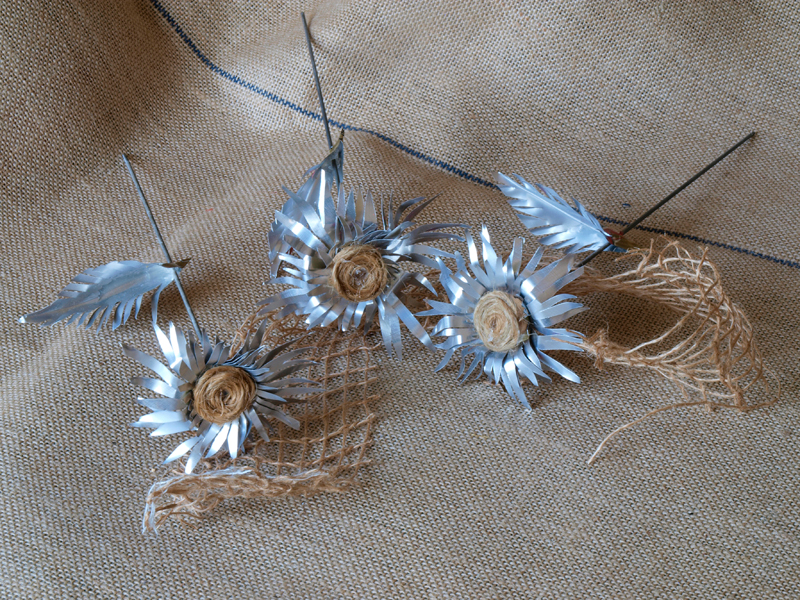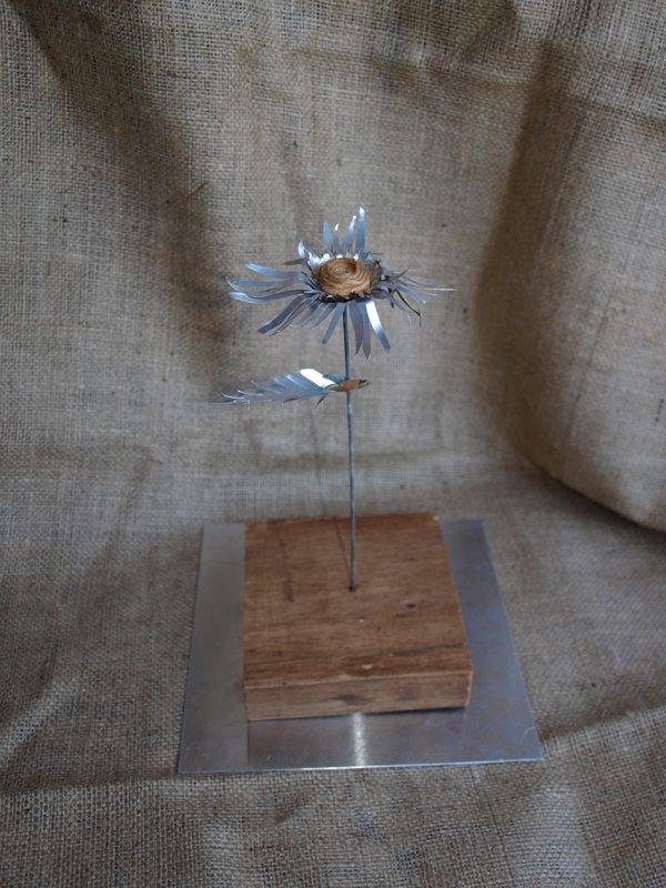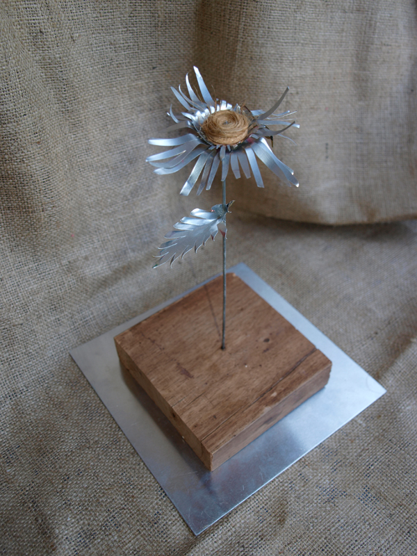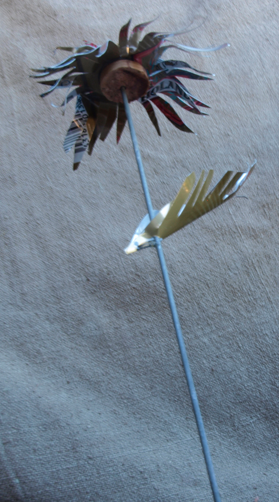 El tallo es el radio de la rueda de una bicicleta, que troceé al máximo. Los pétalos y la hoja son de chapa de lata de refresco, que a veces guardo, y otras y no. La simulación de los estambres es una cuerda de cáñamo enrollada, de esa que siempre anda por casa. Para sujetar el conjunto utilizo corchos de botella de vino, los voy almacenando, soy incorregible.