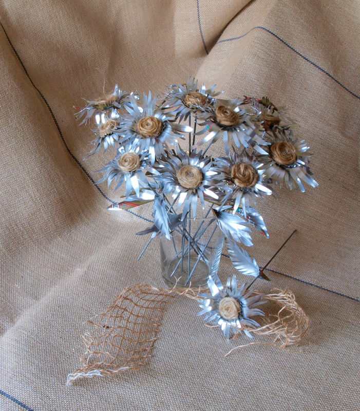 Las flores de hojalata son un recurso utilizado en países donde se agudiza el ingenio para decorar cualquier celebración. Dejándome llevar por el principio de la no generación de residuos creé esta flor. Realizada en diversos materiales, todos de andar por casa y reciclando.