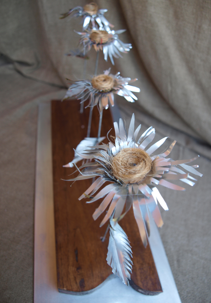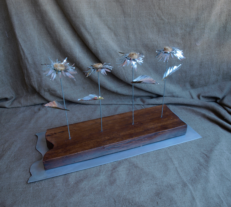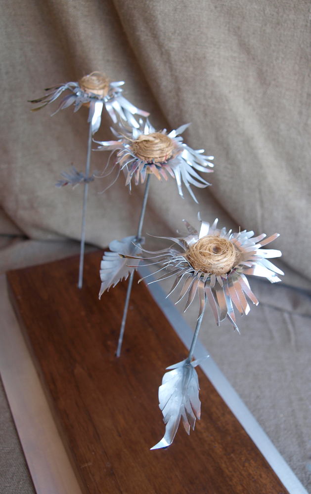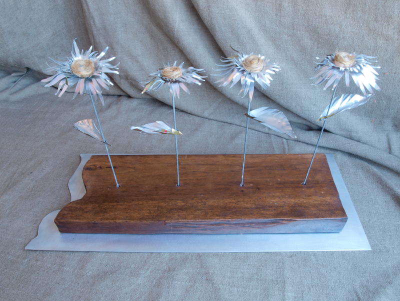 Estas flores de hojalata, de aspecto árido y bello nos recuerdan que muchas veces nosotros podemos mostrarnos de esta manera, listos y lucidos para que nos vean los demás, pero con aristas que generan cierta distancia en nuestro entorno.  Cuando nos enlucimos para los demás muchas veces no tenemos en cuenta que estamos tapando nuestra belleza natural y que sin quererlo los demás lo perciben, ven algo falso, como que pincha y no se atreven a acercarse. Seamos más naturales y no nos dejemos llevar tanto por las normas y las imposiciones sociales. Todos somos bellos a nuestra manera, no nos tapemos y hagámosle ese regalo a los demás, dejemos salir nuestra esencia y permitamos que los demás se nos acerquen y disfruten de nosotros así como nosotros de ellos.