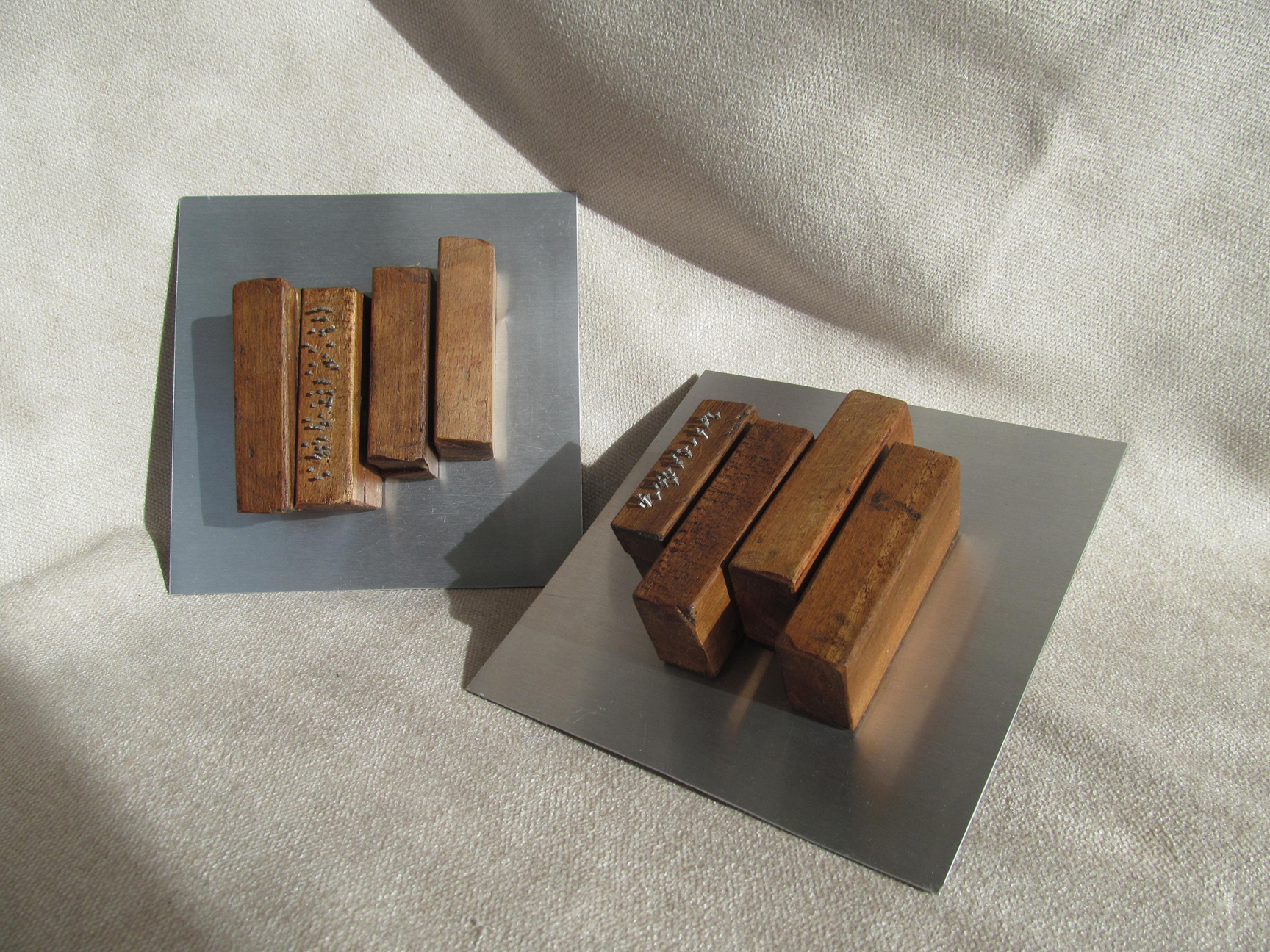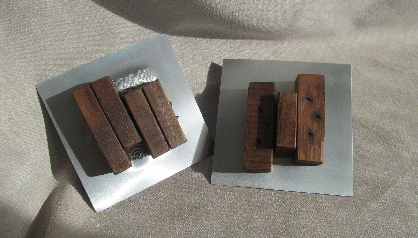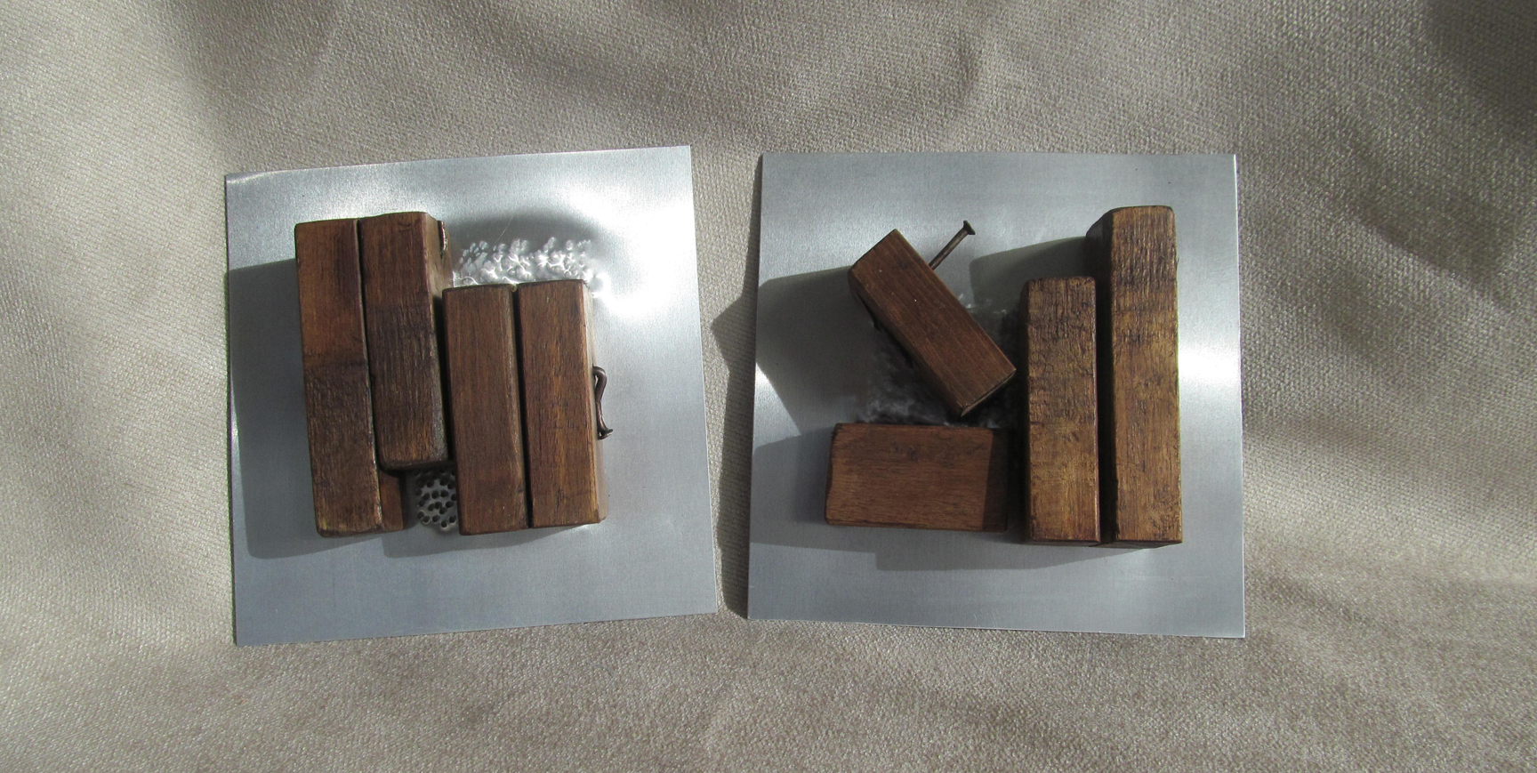 Al principio ideé estos elementos como bases para unas esculturas de mesa. Al tomar las primeras imágenes tuve una visión diferente, se me aparecieron encima de una cama a modo de mural, de escultura modular, encima de un sofá o a la entrada de una casa u oficina. Dada su estructura se adaptarían fácilmente a diversas medidas de cama y cabecero. Están realizados en madera recuperada de muebles antiguos y planchas de aluminio combinados con clavos, algunos añadidos, otros ya estaban. Se pueden realizar en diferentes formas aunque la base es siempre la misma, madera, aluminio y clavos.