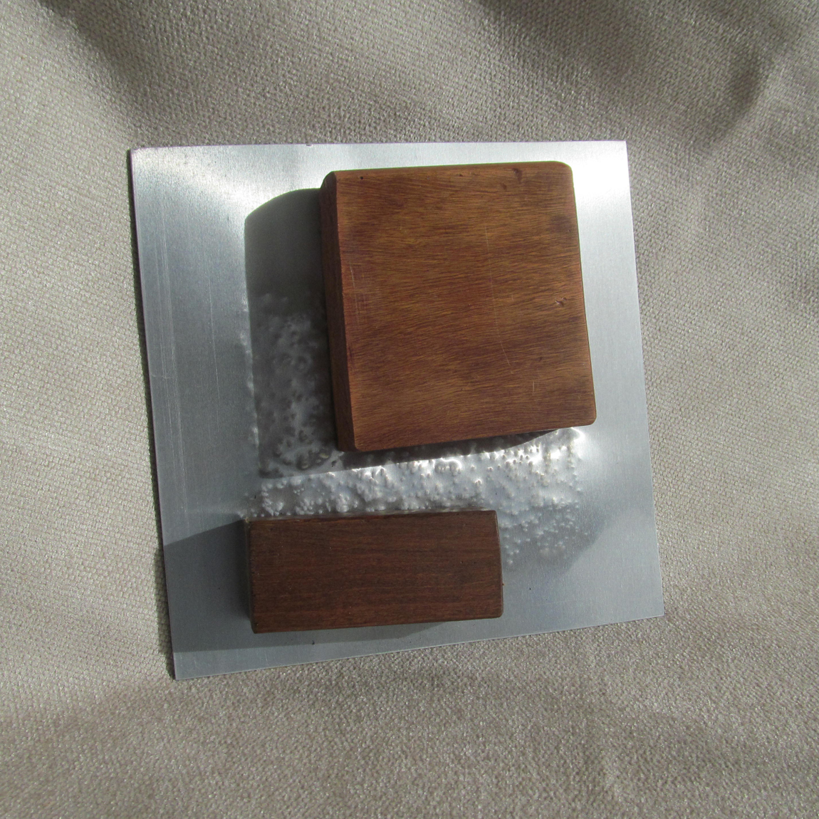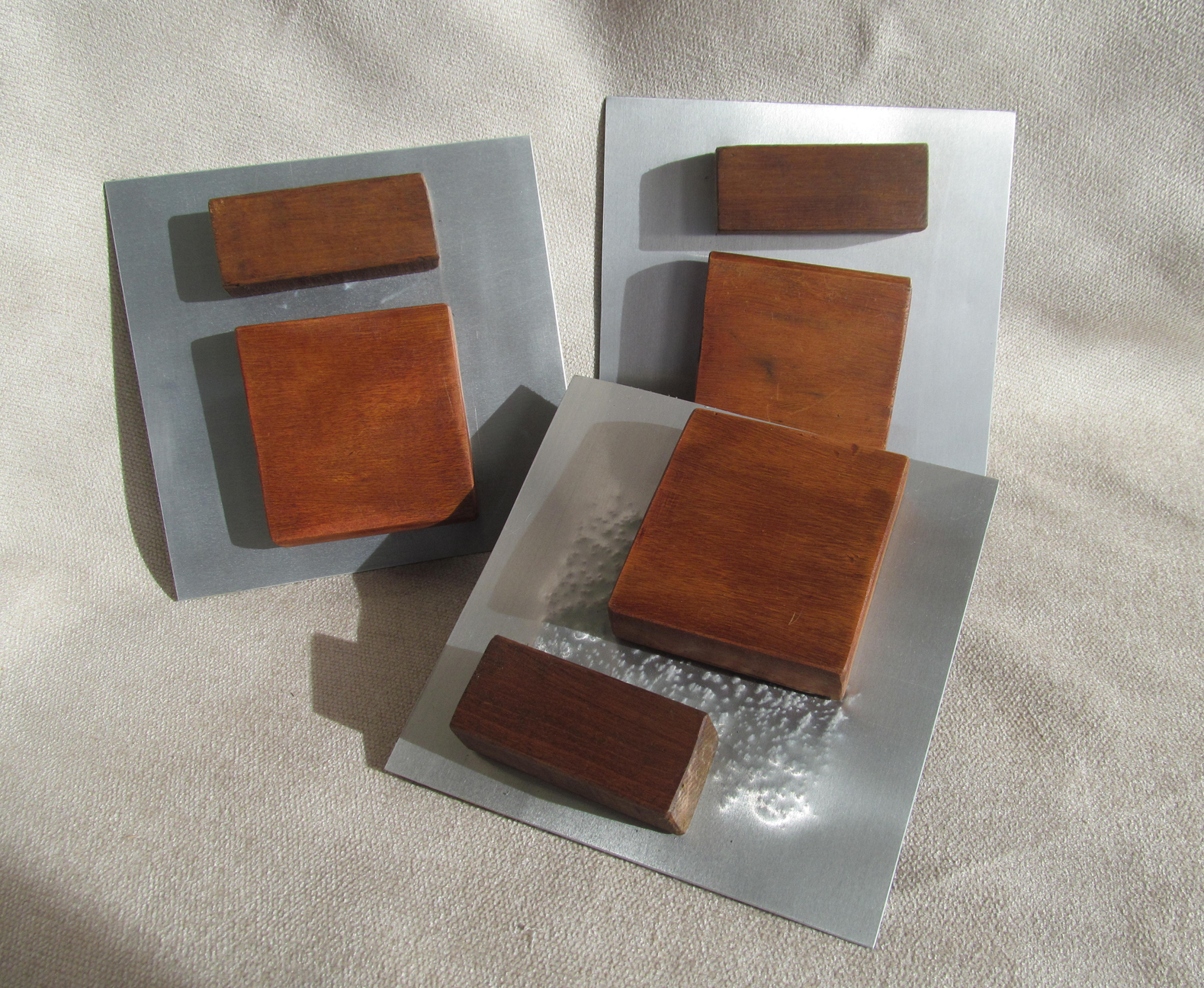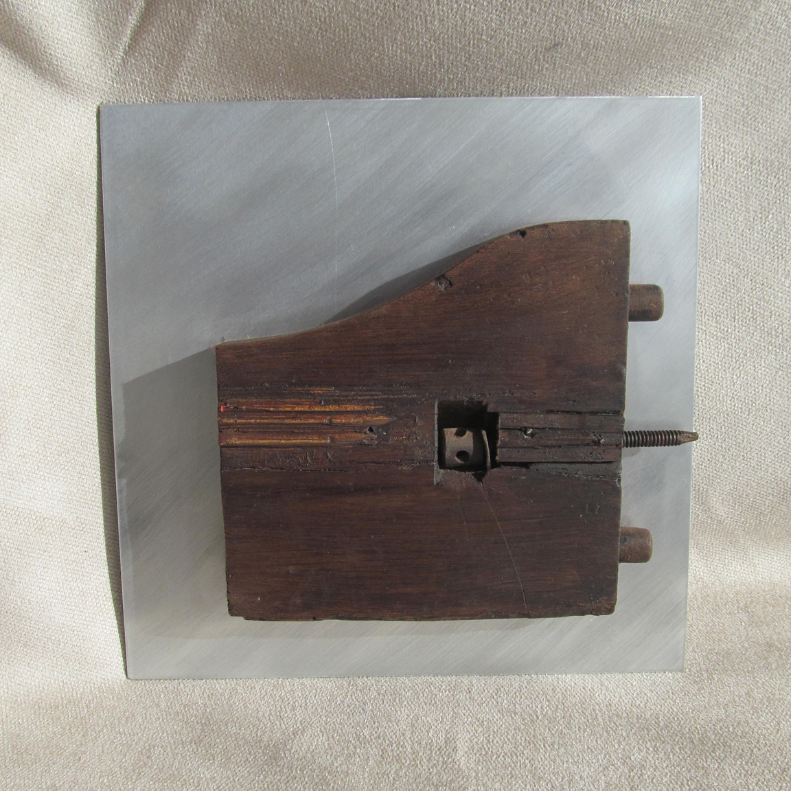 Al principio ideé estos elementos como bases para unas esculturas de mesa. Al tomar las primeras imágenes tuve una visión diferente, se me aparecieron encima de una cama a modo de mural, de escultura modular, encima de un sofá o a la entrada de una casa u oficina. Dada su estructura se adaptarían fácilmente a diversas medidas de cama y cabecero. Están realizados en madera recuperada de muebles antiguos y planchas de aluminio combinados con clavos, algunos añadidos, otros ya estaban. Se pueden realizar en diferentes formas aunque la base es siempre la misma, madera, aluminio y clavos.