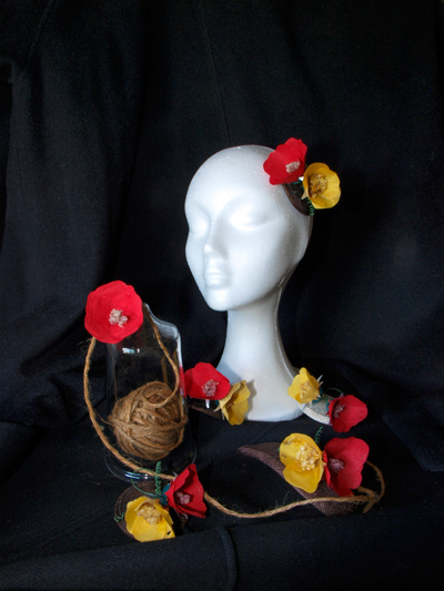 Me gustan las flores de tela, las que se lucen en la solapa, en la cabeza, las que acompañan y alegran los zapatos en un día de fiesta, las que se prenden en un bolso y le dan un toque especial. Tenía muchas telas, y muchas flores en la cabeza y empecé a buscar inspiración, quería hacer algo alegre, algo que también alegrase a su portador, algo especial. Y me salieron unas flores de tela que sirven para varios aderezos, para el pelo, para la solapa, para un bolso, e incluso para nada, para dejarlas en un rincón, como si se tratase de un pedazo de naturaleza artificial que surge en la esquina del salón, algo que nos recuerda que la naturaleza en muy potente y que no podemos dominarla.