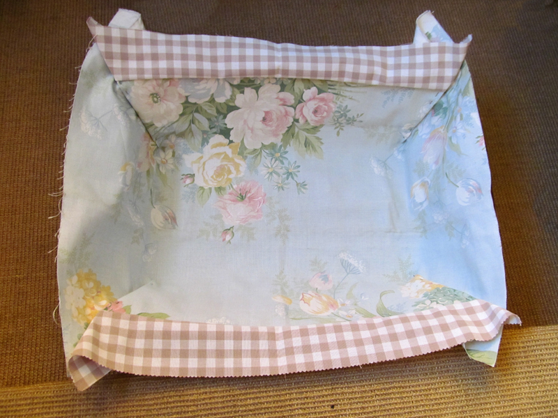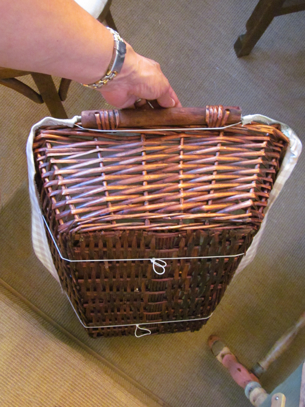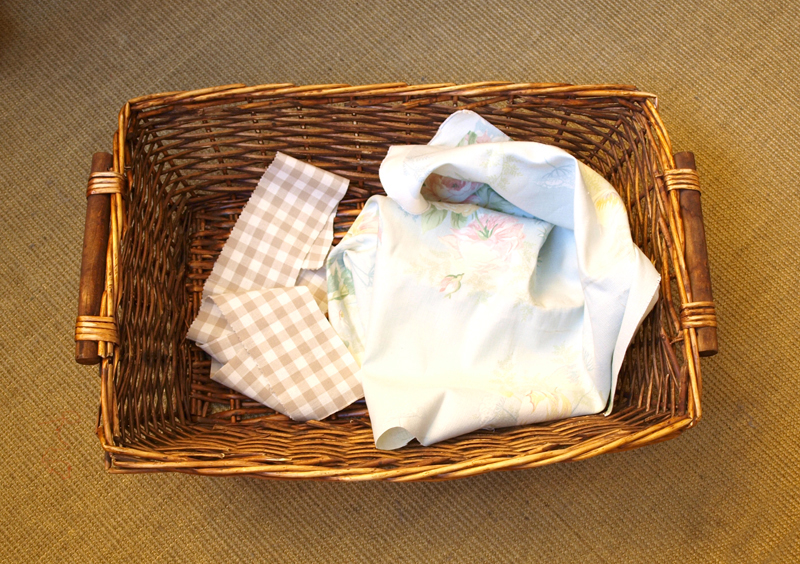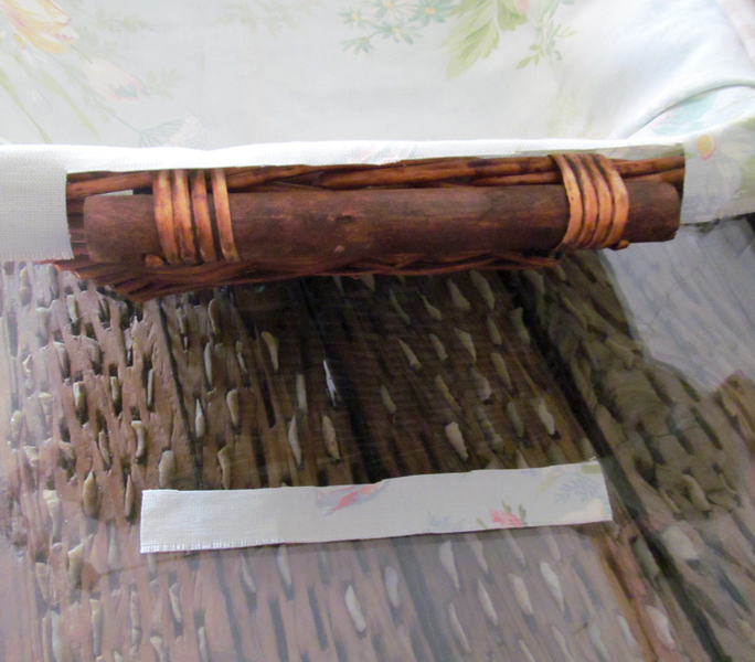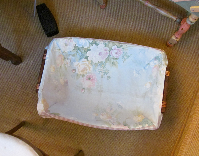 Salía un día de mi casa, y de pronto la vi. Estaba apoyada junto a la farola, y me miraba. No pude contenerme, la recogí, como a varios de los enseres que tengo en casa. Es la típica cesta de navidad, esa que viene cargada de buenos deseos y lo que es mejor de comida y bebida para disfrutar de las fiestas. Tiene el tamaño adecuado para la función que yo pensaba darle y sin pensarlo dos veces, la subía casa. Estuvo un tiempo aparcada, ya que estaba algo deteriorada. Los palitos de mimbre que sobresalían de sus sitios me enganchaban la ropa. Fue un tiempo después de terminar el costurero vintage, que a la vista de que aun no había terminado con los retales, me decidía forrarla.