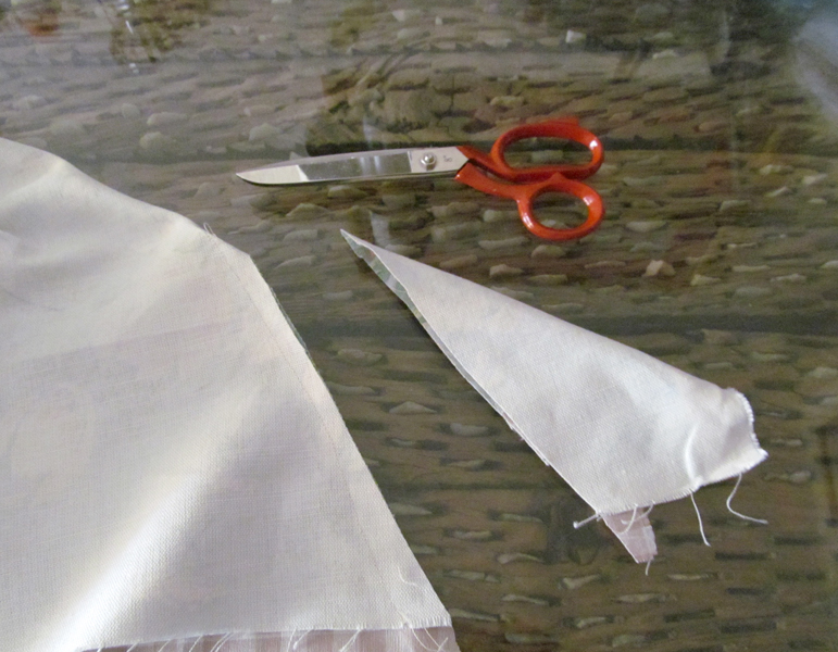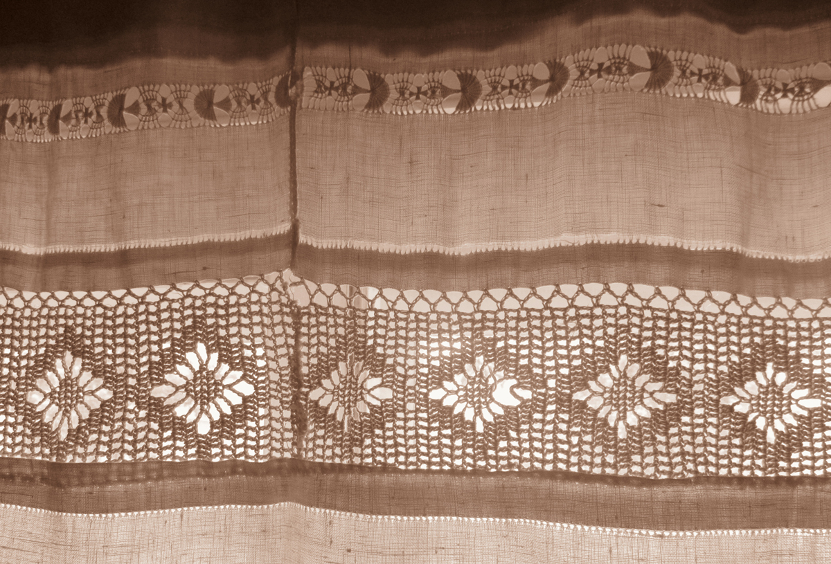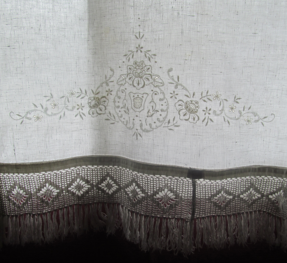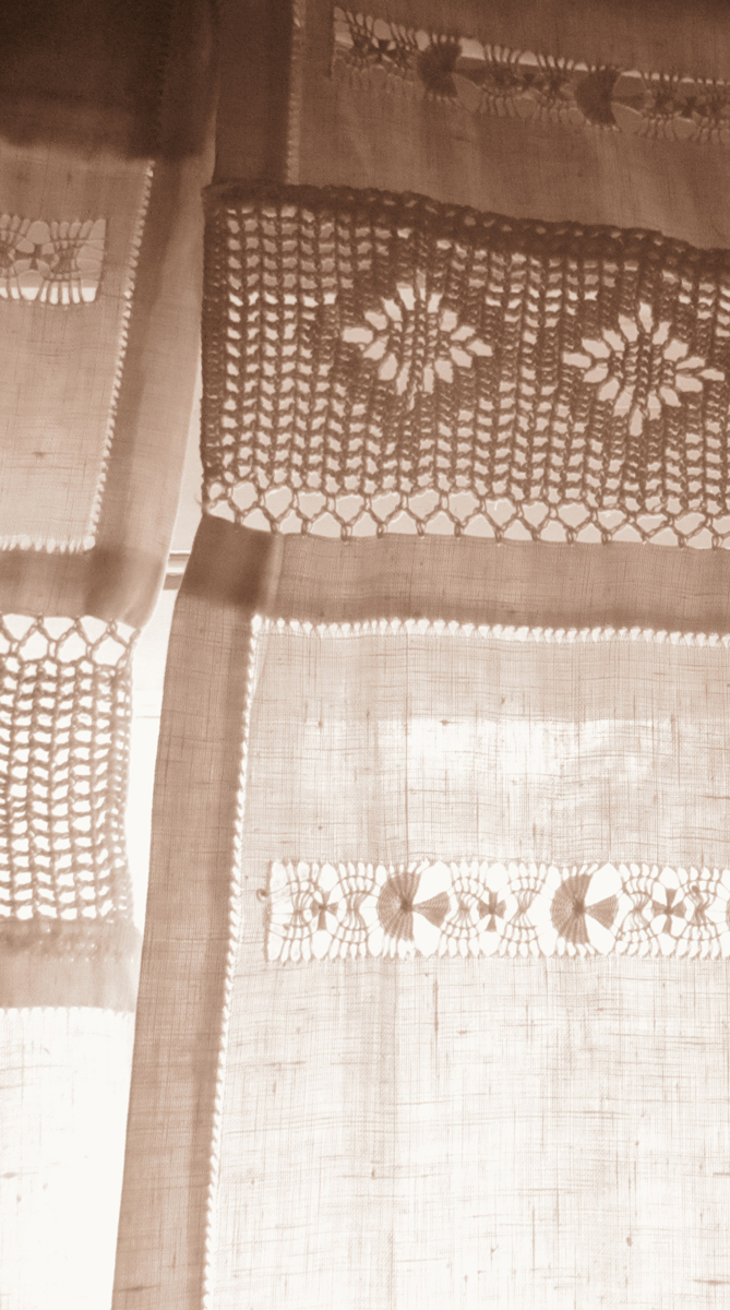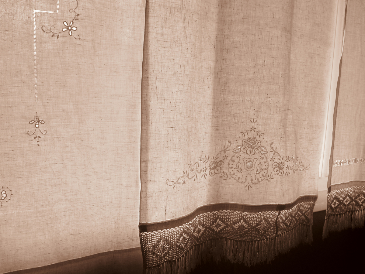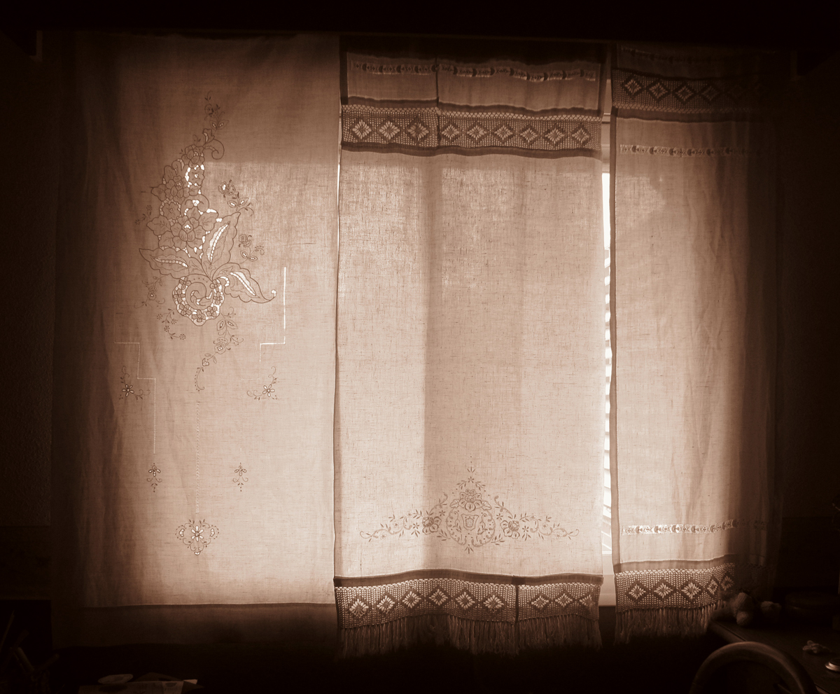 Decidí trasladarlos a mi estudio, enfrentándome de este modo a una dura tarea de reconstrucción e imaginación. La tela descolgada era insuficiente para la nueva ubicación. Echando mano a mis almacenajes de chamarilera, descubrí que tenía guardado el visillo de mi antigua cocina, 12 años en una caja. Este sí que tenía impregnado el color amarillento del que ya hemos hablado. Seguía siendo tela insuficiente. No era motivo para echarme atrás. En la caja e mi ajuar descubrí varias toallas de hilo, de esas que se almidonan y se vuelven a almidonar volviéndose entonces repelentes al agua y dejando de hacer su función. Tomé una de ellas, de un blanco impecable y con un bordado hecho a mano de lo más primoroso.