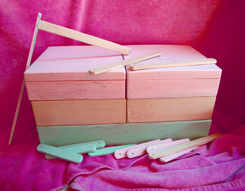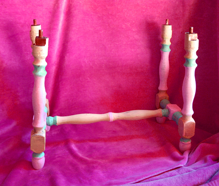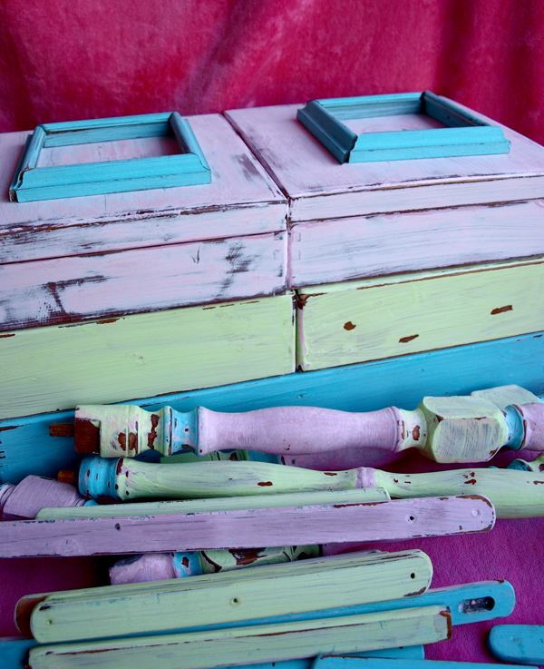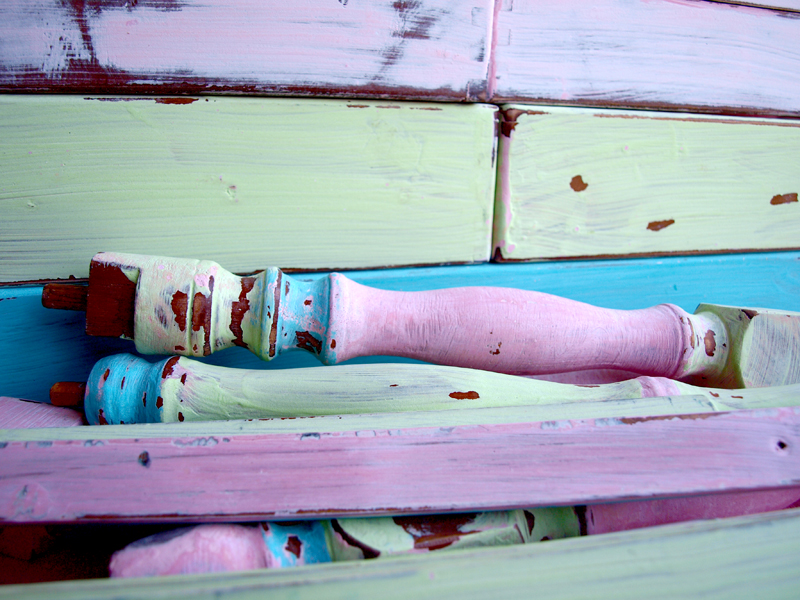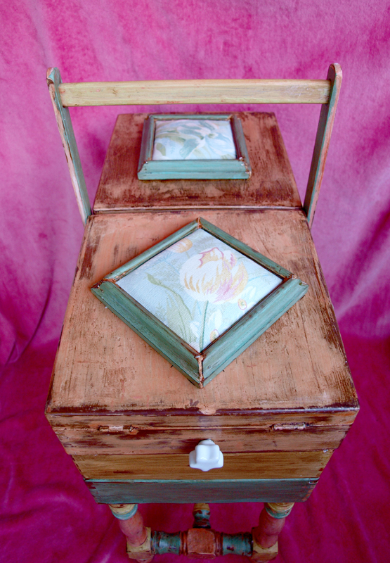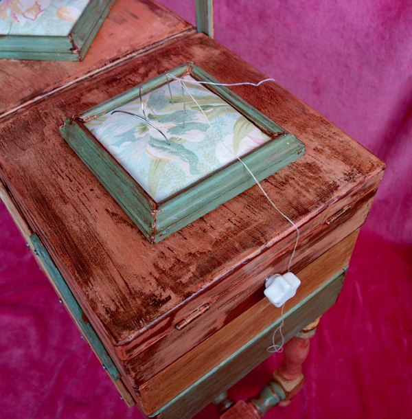 Pinte cada elemento del costurero vintage reciclado en un color y las patas en varios. Elegí estos tres colores, que mas tarde descubrí que son los tres colores que siempre elijo, creo que por no pensar. Me dejé llevar por el flujo ascendente de mi cerebro y no le presté atención a este detalle que en cualquier otro momento sería fundamental. ¡Ah! ya me acuerdo, hacían juego con las telas.