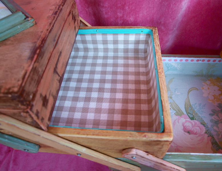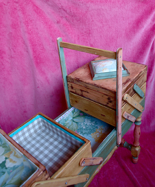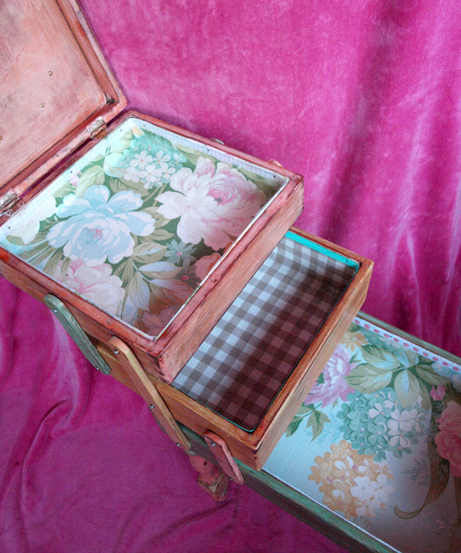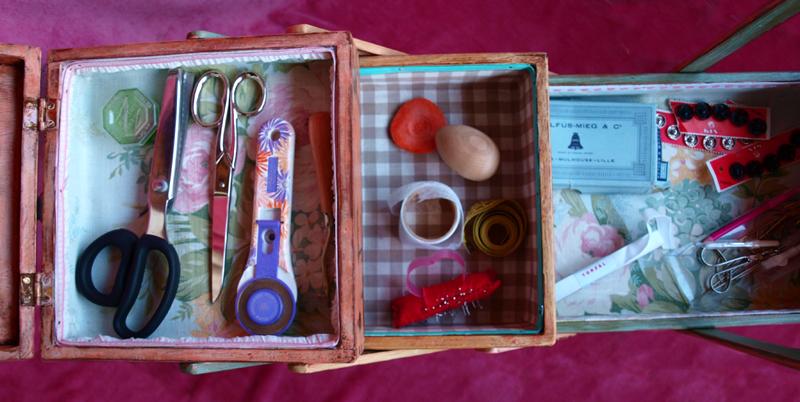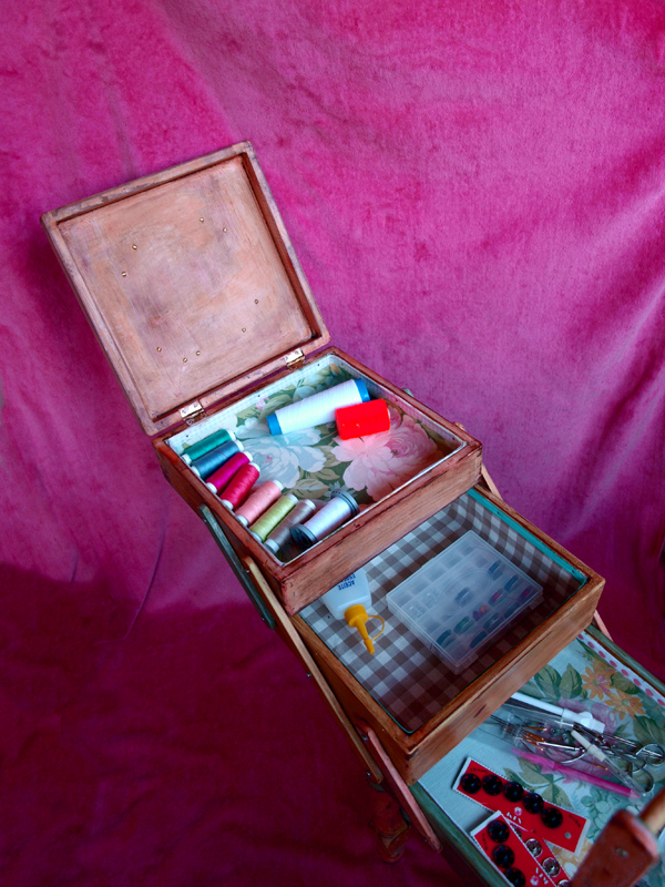 Y lo monte de nuevo. Puse cada cosa en su lugar y ahora tengo un bonito costurero vintage recilado que cada vez que utilizo me recuerda a mi prima Bea. Ella fue quien me lo regalo por mi boda, pero ya en ese día me dijo «no es muy bonito….» Motivo por el cual ha estado esperando a que llegase el día en que en mi «Projet» hubiese una nueva tarea llamada «Reciclaje de costurero viejo».