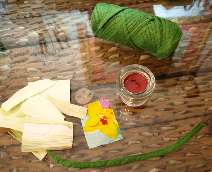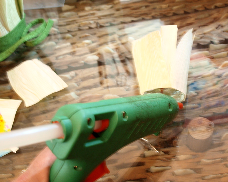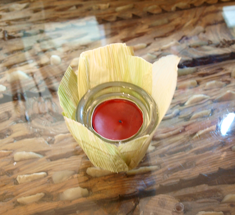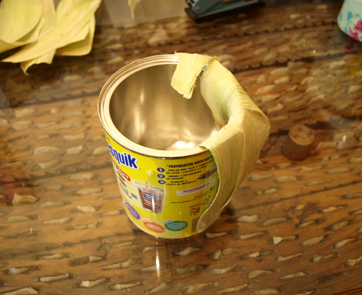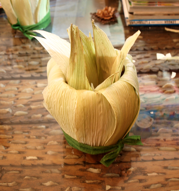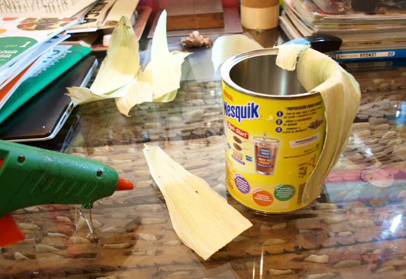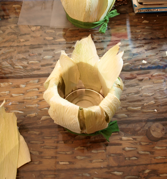 Después de inspirarme un poco por la internet, opté por realizar unos porta velas con las hojas de maíz. Tarea bastante sencilla. Ayudada por la súper pistola térmica y algo de imaginación los realicé en un pis-pas.
