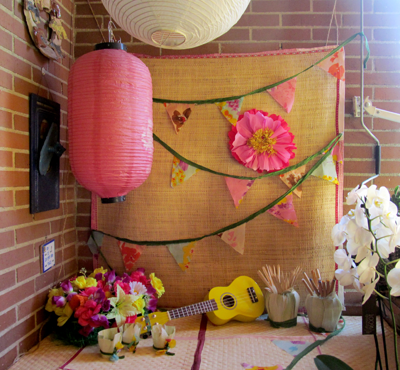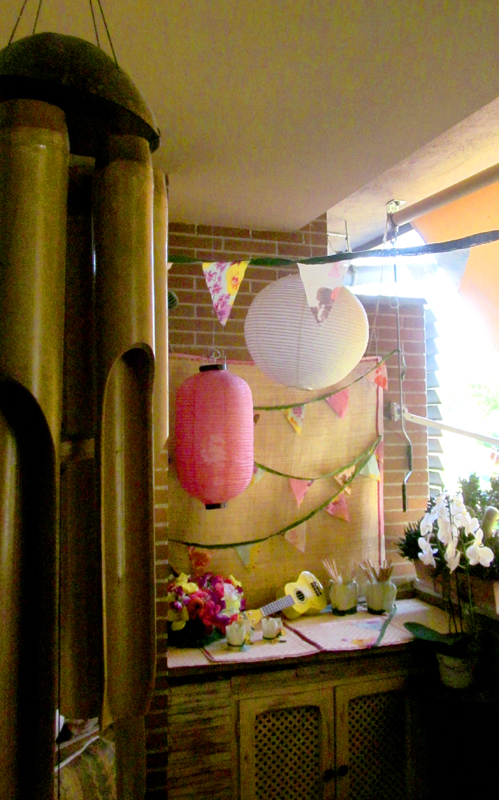 Y con toda esta decoración tan «Kuqui» elaborada a partir de hojas de maíz y un poco de ingenio pude crear un bonito rincón en mi terraza destinado a la zona de bebidas de la fiesta hawaiana que celebramos por los 15 años de Sofía.