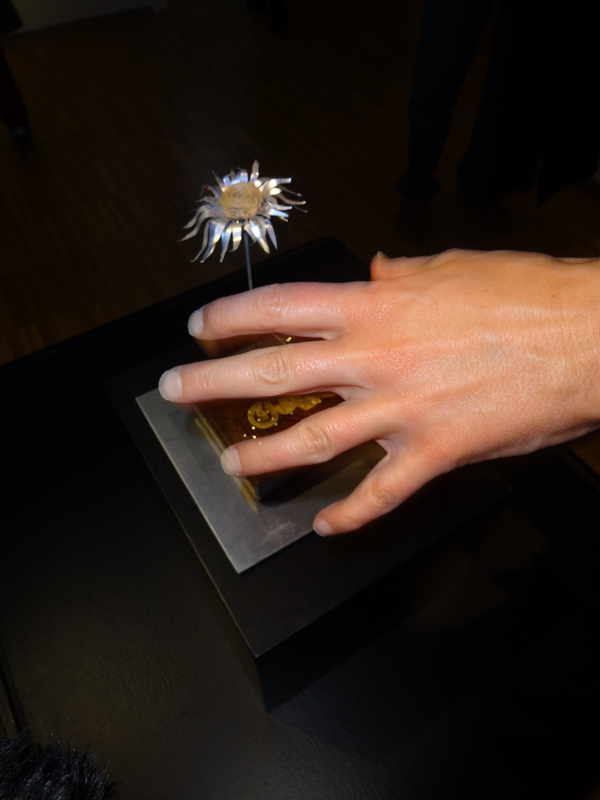 La obra presentada y que se podrá ver hasta el próximo día 27 de Marzo es una Primula Kardinsky, esculturas que realizo a partir de materiales reciclados, e n este caso con aluminio, madera recuperada, sinamay del que se utiliza para hacer tocados, un radio de bicicleta, latas de refresco, corcho de botella y cuerda de cáñamo.