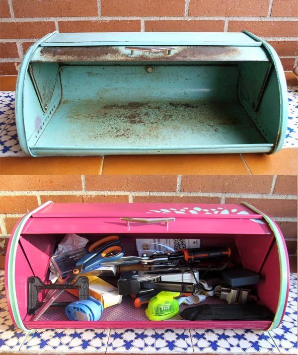 Os dejo unas imágenes del proceso de transformación de la panera reciclada en caja de herramientas